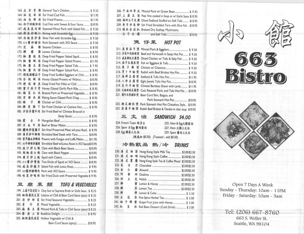 663 Bistro, located in Seattle's Chinatown, offers a wide range of Cantonese cuisine, specializing in seafood and signature Chinese style barbecue. The menu boasts a variety of delectable dishes such as Honey BBQ Pork, Roast Duck, and Soy Sauce Chicken Leg Quarter. Customers rave about the generous portions and flavorful meats, with highlights including the crispy skin on the roast pork and the juicy, tender duck. The Peking Duck is a standout dish, worth the wait and price according to loyal patrons. The casual atmosphere, ample parking, and accommodating service make it a popular spot for groups and families. With options for delivery, takeout, and catering, 663 Bistro is a must-visit for authentic Chinese BBQ in Seattle.